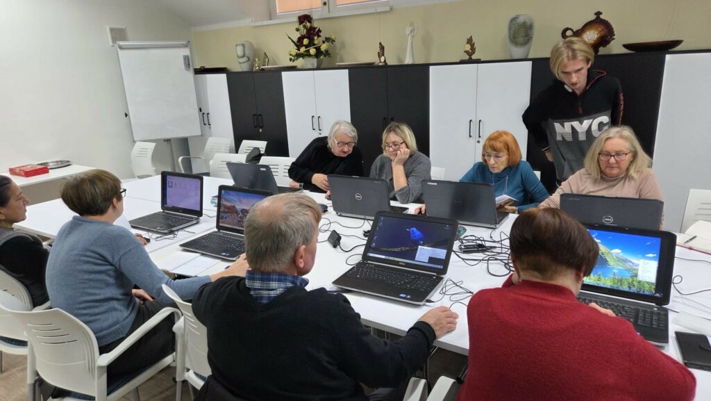 Podczas zajęć seniorzy uczyli się obsługi laptopów i telefonów, poznawali przydatne programy, aplikacje oraz funkcje ułatwiające codzienne życie 💻📱. Kursy obejmowały m.in. podstawy pracy z komputerem, korzystanie z Internetu, komunikację online, a także praktyczne wykorzystanie nowoczesnych technologii w życiu codziennym 📧🌐.